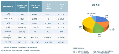 在(zai)完成手術的28例(li)(li)患(huan)者中(zhong),16例(li)(li)(57.1%)獲得病理(li)學(xue)(xue)緩解,包(bao)括7例(li)(li)(25.0%)實現pCR、5例(li)(li)(17.9%)接近病理(li)完全緩解(near pCR),4例(li)(li)(14.3%)部分病理(li)學(xue)(xue)緩解(pPR)。其中(zhong),12例(li)(li)(42.9%)達(da)(da)到主要病理(li)學(xue)(xue)緩解(MPR,包(bao)括pCR和near pCR)。在(zai)Ⅱ期患(huan)者中(zhong),3例(li)(li)(27.3%)達(da)(da)pCR,1例(li)(li)(9.1%)達(da)(da)pPR,pNR率為63.6%;在(zai)Ⅲ期患(huan)者中(zhong),4例(li)(li)(23.5%)達(da)(da)pCR,5例(li)(li)(29.4%)接近pCR,3例(li)(li)(17.6%)達(da)(da)pPR,pNR率為29.4%。