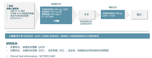 CAP 03-NEO研(yan)究(jiu)(jiu)(NCT05512481)是一項兩階(jie)段(duan)(duan)、單中心、前瞻性臨床試驗,計劃(hua)納(na)(na)入(ru)(ru)60例年(nian)齡18-75歲的可切除Ⅱ/Ⅲ期(qi)肢端黑色(se)素(su)瘤患(huan)(huan)者(zhe)。在(zai)研(yan)究(jiu)(jiu)第一階(jie)段(duan)(duan),擬納(na)(na)入(ru)(ru)30例患(huan)(huan)者(zhe)接(jie)受(shou)兩個周(zhou)期(qi)(每(mei)周(zhou)期(qi)4周(zhou))的三藥新輔助(zhu)治療,方(fang)案包(bao)括卡瑞利(li)珠單抗(kang)(200 mg IV Q2W)、阿帕替尼(250 mg PO QD)和替莫唑胺(200 mg/m2 IV D1-D5 Q4W),隨后進行手術,術后進行14個周(zhou)期(qi)的卡瑞利(li)珠單抗(kang)輔助(zhu)治療(200 mg Q3W)。主要研(yan)究(jiu)(jiu)終(zhong)點(dian)(dian)為病(bing)(bing)理(li)完(wan)全緩解(pCR),次要終(zhong)點(dian)(dian)包(bao)括無事件(jian)生存期(qi)(EFS)、總生存期(qi)(OS)及安全性等(deng)。根據(ju)一階(jie)段(duan)(duan)患(huan)(huan)者(zhe)的病(bing)(bing)理(li)無緩解(pNR)率和風險-獲(huo)益(yi)評估,第二階(jie)段(duan)(duan)將選擇合適(shi)的分(fen)期(qi)患(huan)(huan)者(zhe)繼續納(na)(na)入(ru)(ru)30例接(jie)受(shou)該(gai)圍術期(qi)方(fang)案治療。