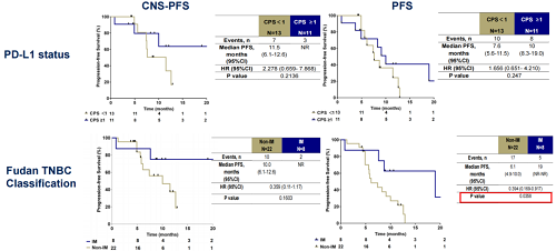 本研究引入了三陰性乳腺癌“復旦(dan)分(fen)型(xing)(xing)”,根(gen)據分(fen)型(xing)(xing)顯(xian)示,在免(mian)(mian)疫(yi)調(diao)(diao)(diao)節(jie)型(xing)(xing)(IM型(xing)(xing))中,CNS-PFS尚未(wei)達到,在非免(mian)(mian)疫(yi)調(diao)(diao)(diao)節(jie)型(xing)(xing)(Non-IM型(xing)(xing))中,CNS-PFS為10個月;整體PFS在免(mian)(mian)疫(yi)調(diao)(diao)(diao)節(jie)型(xing)(xing)(IM型(xing)(xing))和非免(mian)(mian)疫(yi)調(diao)(diao)(diao)節(jie)型(xing)(xing)(Non-IM型(xing)(xing))展示出明顯(xian)差(cha)異(yi),PFS分(fen)別為19個月和6.1個月。