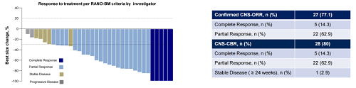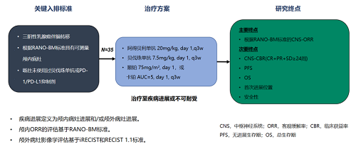 研究主要(yao)終點為根據RANO-BM標準評估的中(zhong)樞神經(jing)系統(tong)客(ke)觀(guan)緩(huan)解率(lv)(CNS-ORR),次要(yao)終點包(bao)括(kuo)中(zhong)樞神經(jing)系統(tong)臨(lin)床(chuang)獲益率(lv)(CNS-CBR)、無進展(zhan)生存期(PFS)、總(zong)生存期(OS)、首次進展(zhan)位置及安全性。