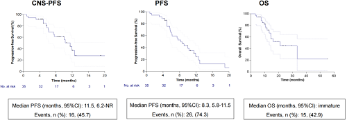 中位(wei)隨訪時間為(wei)17.5個(ge)月(yue),確認的CNS-ORR為(wei)77.1%(27/35),確認的CNS-CBR為(wei)80%(28/35),CNS-PFS為(wei)11.5個(ge)月(yue)(6.2-NR),整體mPFS為(wei)8.3個(ge)月(yue)(5.8-11.5),中位(wei)OS尚(shang)不成熟。