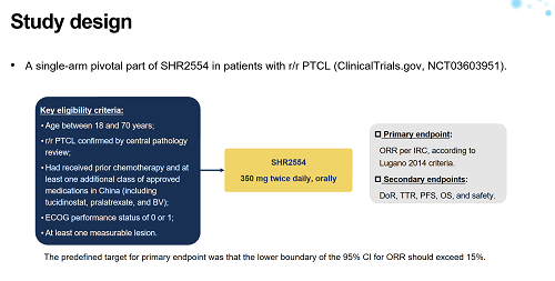 該研(yan)究(jiu)納入(ru)了既(ji)往接(jie)受(shou)過(guo)化療和(he)至(zhi)(zhi)少(shao)一種其他獲批(pi)藥(yao)物治療的R/R PTCL患者,給予(yu)SHR2554 350 mg每日2次口服治療。研(yan)究(jiu)的主要終(zhong)點是(shi)獨立審查委員會(IRC)根據(ju)Lugano 2014標(biao)準評估的客觀緩解率(lv)(ORR),主要終(zhong)點的預設目標(biao)是(shi)ORR的95%置信區間(95% CI)下限應超過(guo)15%。次要終(zhong)點包(bao)括(kuo)緩解持續時(shi)(shi)間(DoR)、至(zhi)(zhi)緩解時(shi)(shi)間(TTR)、無進展生存期(qi)(PFS)、總生存期(qi)(OS)和(he)安全性(xing)。