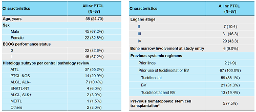 研究共納入(ru)67例(li)患(huan)者(zhe)(zhe)接(jie)受(shou)SHR2554治療(liao),包括37例(li)(55.2%)血管免疫(yi)母細(xi)胞(bao)性(xing)T細(xi)胞(bao)淋(lin)(lin)巴(ba)瘤(AITL),14例(li)(20.9%)PTCL-NOS,7例(li)(10.4%)間(jian)變(bian)性(xing)淋(lin)(lin)巴(ba)瘤激(ji)酶陰性(xing)的間(jian)變(bian)性(xing)大(da)細(xi)胞(bao)淋(lin)(lin)巴(ba)瘤(ALCL,ALK-),4例(li)(6.0%)結外NK/T淋(lin)(lin)巴(ba)細(xi)胞(bao)淋(lin)(lin)巴(ba)瘤鼻(bi)型(ENKTL-NT),2例(li)(3.0%)ALCL-ALK陽(yang)性(xing)(ALCL,ALK+),1例(li)(1.5%)單(dan)形性(xing)嗜上皮(pi)性(xing)腸道T細(xi)胞(bao)淋(lin)(lin)巴(ba)瘤(MEITL),2例(li)(3.0%)其他亞型。既往中位治療(liao)線(xian)數為2(范圍(wei),1-9)。所(suo)有患(huan)者(zhe)(zhe)既往均(jun)接(jie)受(shou)過(guo)化療(liao)方案;此外,所(suo)有患(huan)者(zhe)(zhe)均(jun)接(jie)受(shou)過(guo)西(xi)達本胺或維(wei)布妥(tuo)昔單(dan)抗治療(liao)(西(xi)達本胺,59[88.1%];維(wei)布妥(tuo)昔單(dan)抗,21[31.3%];同時接(jie)受(shou)過(guo)兩種(zhong)藥物治療(liao),13[19.4%])。