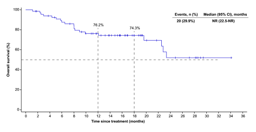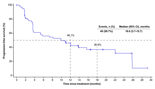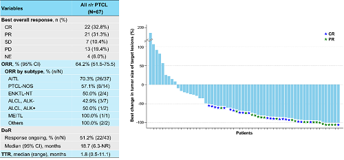 截(jie)至2024年12月20日,中(zhong)位(wei)(wei)隨(sui)訪時(shi)間15.2個(ge)月,22例(32.8%)患(huan)者達(da)(da)到(dao)(dao)完(wan)全緩(huan)(huan)解,21例(31.3%)達(da)(da)到(dao)(dao)部(bu)分緩(huan)(huan)解,IRC評估的ORR為64.2%(95% CI,51.5-75.5)。在所有亞型中(zhong)均觀(guan)察(cha)到(dao)(dao)獲益(ORR:AITL,70.3%[26/37];PTCL-NOS,57.1%[8/14];ENKTL-NT,50.0%[2/4];ALCL,ALK-,42.9%[3/7];ALCL,ALK+,50.0%[1/2];MEITL,100%[1/1];其他,100%[2/2])。在出現緩(huan)(huan)解的患(huan)者中(zhong),51.2%(22/43)的患(huan)者目前(qian)仍在緩(huan)(huan)解中(zhong),估計(ji)的中(zhong)位(wei)(wei)DoR為18.7個(ge)月(95% CI,6.3-未達(da)(da)到(dao)(dao)[NR])。中(zhong)位(wei)(wei)PFS為10.0個(ge)月(95% CI,3.7-15.7),中(zhong)位(wei)(wei)OS尚未達(da)(da)到(dao)(dao)。安全性整體可控。
