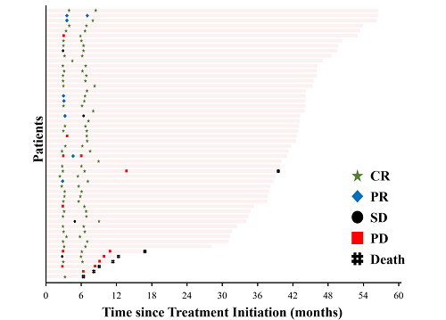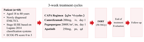 該研究(jiu)為一項前瞻性、多中心(xin)、單臂研究(jiu),納入標(biao)準為:根據WHO2016標(biao)準確診的(de)初發(fa)NK/T細胞淋巴(ba)瘤患(huan)者,至少(shao)有1個(ge)可(ke)測量病(bing)灶,Lugano 2014分類(lei)為IE/IIE期(qi),年齡18~80歲(sui),ECOG PS評(ping)分為0~2分。患(huan)者共接受4個(ge)周(zhou)期(qi)的(de)治療(liao),以21天(tian)為周(zhou)期(qi),第1天(tian)靜脈注(zhu)射卡瑞利珠單抗200 mg,肌肉注(zhu)射培(pei)門(men)冬酶(mei)2000 U/m2,阿帕替尼(ni)250 mg,QD。全身治療(liao)后(hou),兩周(zhou)內給(gei)予總劑量為50~56 Gy的(de)擴大(da)野(ye)放(fang)療(liao)。主要終點為放(fang)療(liao)后(hou)(24周(zhou))的(de)CRR。次要終點包括24周(zhou)(24W) ORR、2年OS、2年無進展生存期(qi)(PFS)和安(an)全性。