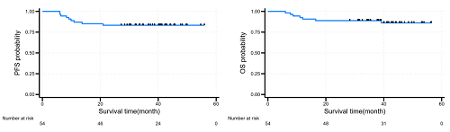 截至2025年(nian)(nian)2月,中位隨訪時間42.2個(ge)月(34.7-46.1),2年(nian)(nian)PFS率(lv)為(wei)83.3%(95% CI:70.4-91.0),2年(nian)(nian)OS率(lv)達(da)到(dao)88.9%(95% CI:76.9-94.9)。