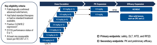 這是一項(xiang)SHR-A1904在晚期(qi)或(huo)轉移性實(shi)體瘤患(huan)者中的(de)多中心(xin)、劑量爬坡、PK拓展和(he)療(liao)效拓展的(de)I期(qi)臨床(chuang)試(shi)驗(yan)。本文報道(dao)了SHR-A1904在晚期(qi)經治GC/GEJC患(huan)者中的(de)研究(jiu)數據。