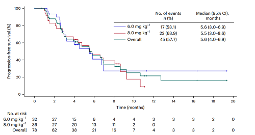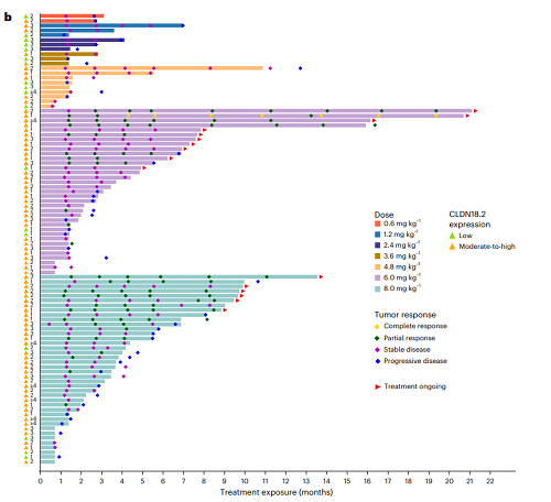 在(zai)療效方面,探索性生(sheng)物標志物分(fen)析發現,CLDN18.2表達(da)(da)(da)水平與療效呈正(zheng)相關(guan),CLDN18.2中(zhong)高表達(da)(da)(da)的患者(zhe)對SHR-A1904的治療響(xiang)應(ying)更好。在(zai)74例可(ke)評估的患者(zhe)中(zhong),1例患者(zhe)達(da)(da)(da)到(dao)(dao)完全緩解(jie)(jie),25例患者(zhe)達(da)(da)(da)到(dao)(dao)部分(fen)緩解(jie)(jie),客觀(guan)緩解(jie)(jie)率(ORR)為(wei)35.1%(95% CI,24.4–47.1),確認的ORR為(wei)23.0%(95% CI,14.0–34.2)。在(zai)6.0mg/kg和(he)(he)(he)8.0mg/kg兩個(ge)(ge)(ge)劑(ji)量(liang)組中(zhong),確認的ORR分(fen)別為(wei)26.7%(95% CI,12.3–45.9)和(he)(he)(he)26.5%(95% CI,12.9–44.4);中(zhong)位緩解(jie)(jie)持續時間(jian)分(fen)別為(wei)未(wei)達(da)(da)(da)到(dao)(dao)(95% CI,4.2個(ge)(ge)(ge)月(yue)(yue)–未(wei)達(da)(da)(da)到(dao)(dao))和(he)(he)(he)8.1個(ge)(ge)(ge)月(yue)(yue)(95% CI,3.9–未(wei)達(da)(da)(da)到(dao)(dao))。中(zhong)位無進(jin)展生(sheng)存(cun)期(PFS)在(zai)總(zong)體人(ren)群中(zhong)為(wei)5.6個(ge)(ge)(ge)月(yue)(yue)(95% CI,4.0–6.9),在(zai)6.0mg/kg和(he)(he)(he)8.0mg/kg兩個(ge)(ge)(ge)劑(ji)量(liang)組中(zhong)分(fen)別為(wei)5.6個(ge)(ge)(ge)月(yue)(yue)(95% CI,3.0–6.9)和(he)(he)(he)5.5個(ge)(ge)(ge)月(yue)(yue)(95% CI,3.0–8.6)。